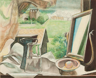 seems to ask ‘Hélion?’. (The picture is also a part-sequel to The Studio of 1953 [54.], a mid-career stock-taking over which the ghost of Courbet also hangs- though this time the visual 'key' in the bottom corner is a portable set of drawers, which allude to the picture's abundant nesting of images within images, illusions pulled-out or shut-away. The artist's avatar in this case is a compartmentalized box of tricks.)